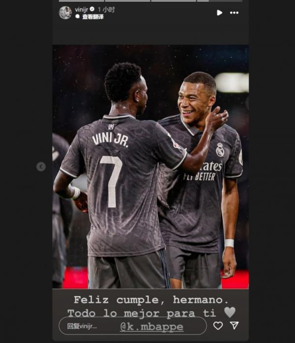哥倆好!維尼修斯社媒祝福姆巴佩:生日快樂兄弟,祝你一切順利