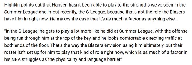 “在發(fā)展聯(lián)盟的賽場(chǎng),他的打法更貼近夏聯(lián)的狀態(tài):進(jìn)攻端由他在罰球線頂端發(fā)起,無(wú)論攻防兩端,他指揮球隊(duì)進(jìn)攻的表現(xiàn)都顯得游刃有余。這也是開拓者最終想要打造的他的比賽方式,但球隊(duì)目前的陣容配置,還無(wú)法讓他承擔(dān)這樣的角色——這一點(diǎn),與身體對(duì)抗強(qiáng)度、語(yǔ)言障礙一樣,都是他在NBA賽場(chǎng)掙扎的關(guān)鍵原因。”