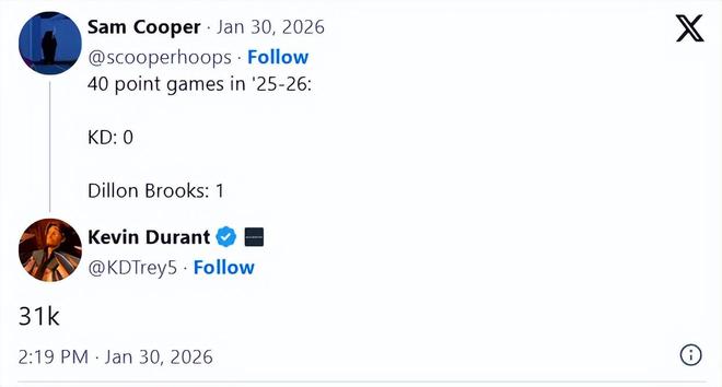 作為交易杜蘭特的籌碼之一,狄龍本賽季的表現(xiàn)非常出色,近日單場轟下40分,創(chuàng)生涯新高。有球迷指出,效力太陽隊(duì)期間,狄龍的40+得分場次是1場,比杜蘭特(0場)還多,杜蘭特則回復(fù)道:“31K”,顯然是以自己生涯累計(jì)31736分的成就予以回應(yīng)。
